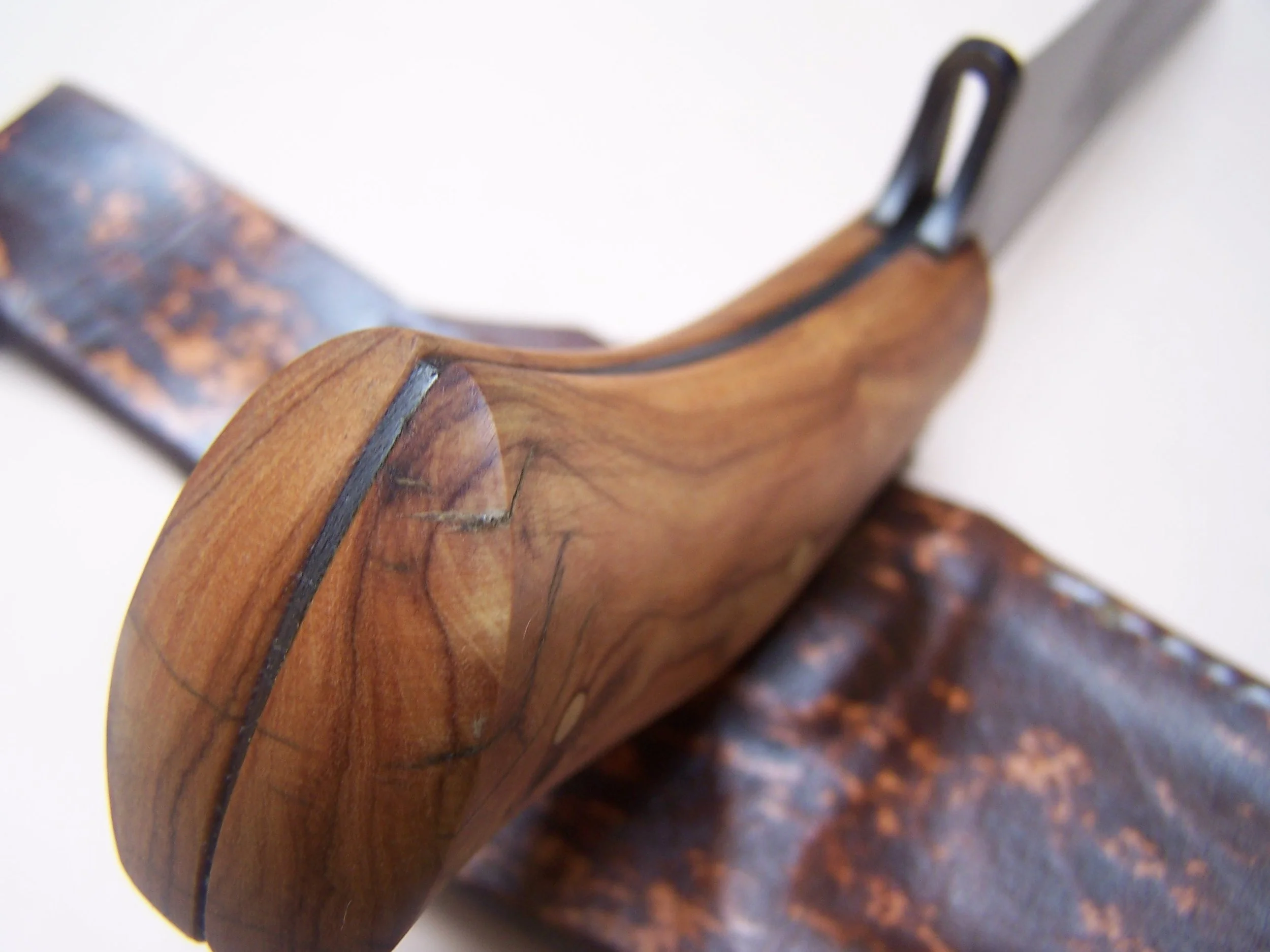 Now to specifics. The blade is Damascus made by me comprised of 320 layers of 5160, 15n20, and 1075 steel 100% hand forged to shape, and fully hardened then differentially tempered which results in exceptional toughness.The blade is tapered from tip to heel for optimum balance.I chose olivewood for its toughness and beauty and it is epoxied and pinned with brass with a museum fit. This ensures that you will never be hindered by a sharp tang that becomes bothersome by shrinking wood which would leave it exposed. The sheath is 7oz vegetable tanned leather which is wet formed and hand stitched by me here in my shop. The finish is what I call “Pinto Bean” which is accomplished in stages.